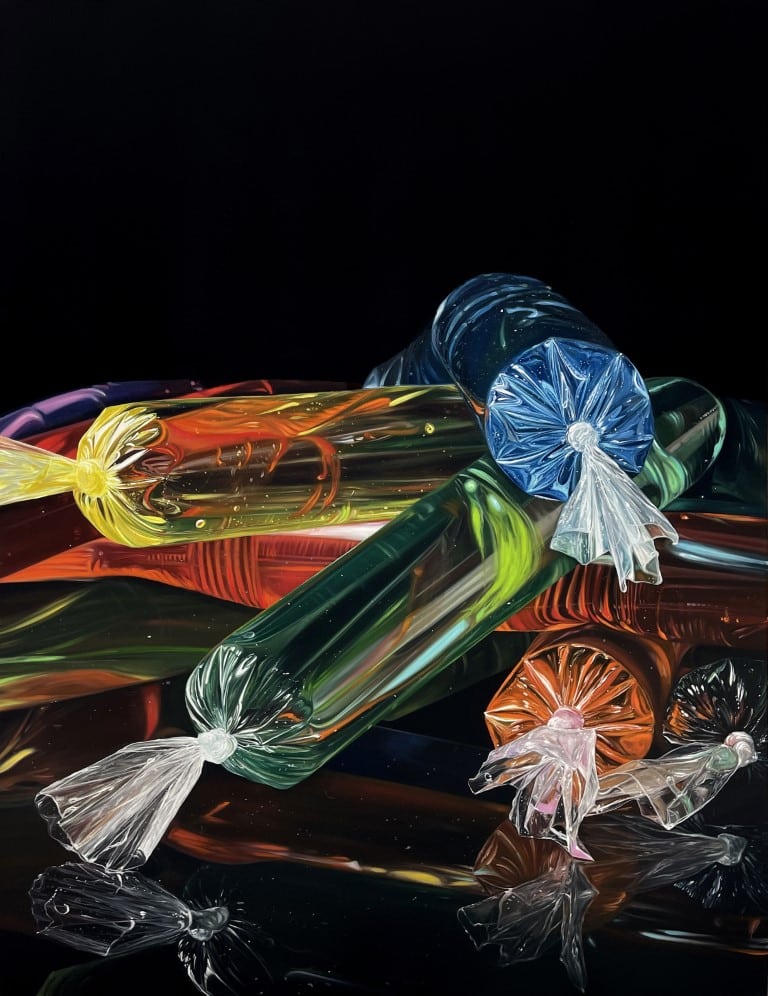 ADN (2022) surge de varias exploraciones formales que Villabon ha venido trabajando: la luz, la oscuridad, el color y la materialidad misma de las bolsas. Asimismo, proviene del análisis fotografíco de las películas y de la literatura universal, citadas en diferentes piezas. La sensibilidad del artista por ciertas imágenes populares da cuenta de pinturas excepcionalmente detalladas en las que evidenciamos mini figuras lego de personajes de Star Wars, Micky Mouse y Alicia en el país de las Maravillas; referentes comunes que llevan a pensar en el aspecto Pop de las obras. Sin embargo, las reflexiones de Villabón sobrepasan el juego de estas representaciones pictóricas cotidianas pues aluden al plástico como un arma silenciosa que afecta el medio ambiente, y por ende, nuestras vidas.